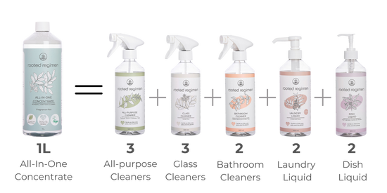 1L of All-In-One Concentrate makes 12 bottles of various cleaners, giving you everything you need to keep your home clean from top to bottom.