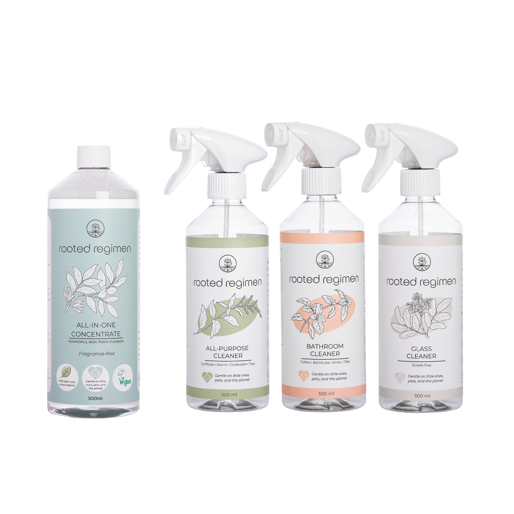 Tackle every cleaning task in your home, from floors and counters to bathrooms and glass, with the Rooted Regimen Cleaning Essentials Kit. This kit provides everything you need for a naturally effective clean, without any toxins or artificial chemicals. Our formulas are 100% plant and mineral based and safe for everyone including little ones, pets and the chemically sensitive.