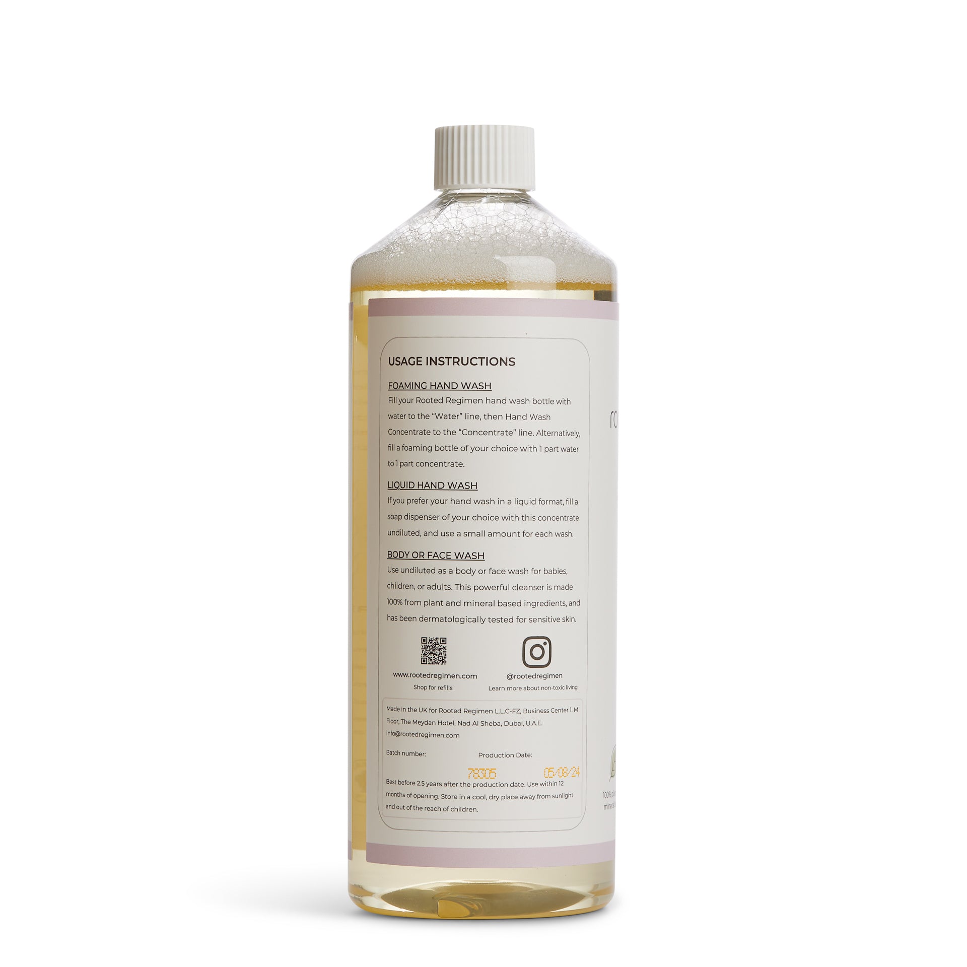 - Versatile: Use it diluted as a foaming hand wash with Rooted Regimen's Glass Foaming Hand Wash bottle. Also use it undiluted as a liquid hand soap in a dispenser of your choice, or as a gentle body and face wash for the whole family, including infants and babies.