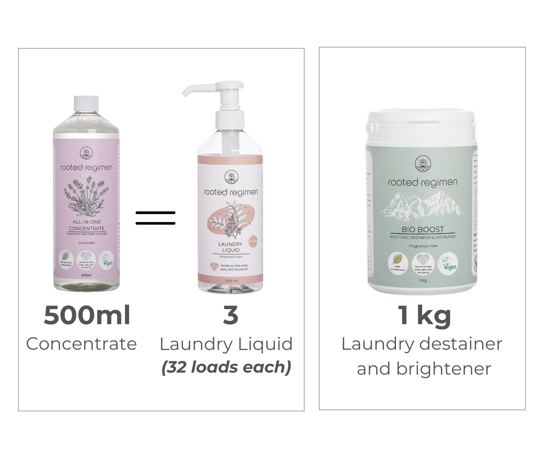 Our versatile All-In-One Concentrate dilutes to create up to 3 bottles of Laundry Liquid (that's 96 loads!), making it an economical and eco-friendly choice. Combined with our Bio Boost, a 100% mineral-based destainer and brightener, your clothes will be clean, bright, and fresh, naturally. Perfect for everyone including newborns and the chemically sensitive.